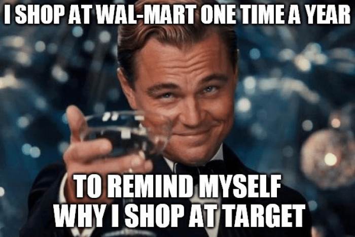ANYWAY, Target and Walmart have all the same things: Hairspray, Doritos, Double Sided Tape, Paw Patrol Underwear (2T/3T), Mint Chocolate Chip Ice Cream, a Harry Potter T-Shirt, and of course off brand Diapers. But what’s the MAIN difference? No, not the price, we all know you’ll get a banging deal at the Walmart, duh. One is red and the other is blue? You’re getting warmer… It’s the ambiance. Yes, I said it. I know some big words too…
